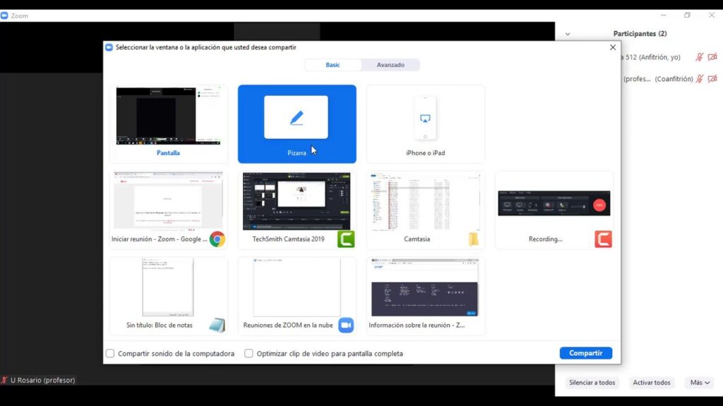 - Selecciona la pantalla o la ventana que deseas compartir.